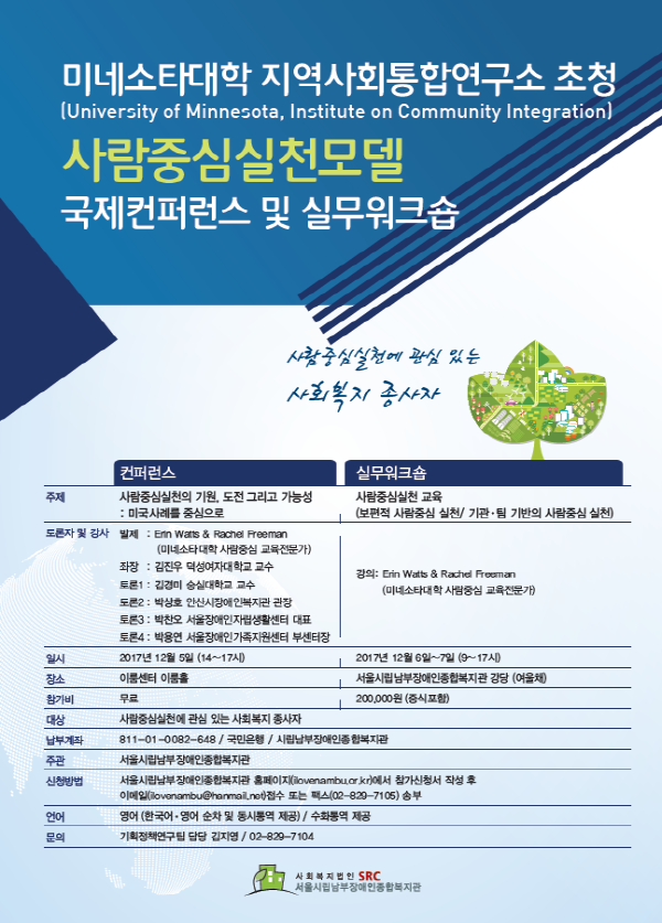 먼저 1부에서는 미국 미네소타대학 지역사회통합연구소 사람중심 실천 교육 전문가 Erin Watts와 Rachel Freeman이 사람중심실천의 기원, 도전, 그리고 가능성에 대한 미국의 사례를 발표할 예정이다.