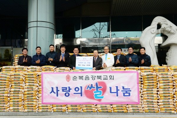 지난 22일 서울 동대문구에 순복음 강북교회가 ‘2018 따뜻한 겨울나기’ 성품으로 10kg 쌀 400포(4톤·840여만원 상당)를 기탁했다. 사진은 강북교회 정문에서 백미 400포를 전달받은 유덕열 구청장(왼쪽에서 다섯 번째)이 관계자들과 기념촬영을 하고 있는 모습.(사진제공=동대문구청)
