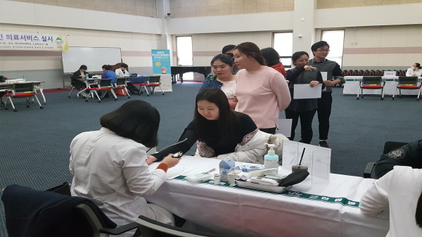 인천 계양구는 지난 22일 경인여자대학교 국제교육원 스포토피아에서 계양구 보건소 주관으로 한림병원, 대한결핵협회 등 20명의 의료진과 함께 외국인(중국·몽골·베트남 등) 유학생 60여명에게 휴먼의료 서비스를 실시했다. 사진은 참여자들이 검진받고 있는 모습.(사진제공=계양구청)