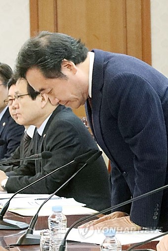 이낙연 국무총리가 23일 오전 서울 세종로 정부서울청사에서 열린 국정현안점검조정회의에서 세월호 유골 발견 은폐에 대해 다시 한번 사과한다며 일어서서 고개 숙여 사과하고 있다.