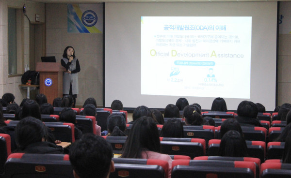 지난 22일 충남외국어고등학교는 시청각실에서 학생들을 대상으로 코이카(KOICA·한국국제협력단)에 관한 진로특강을 실시했다. 사진은 코이카에 근무하는 김용정 강사로부터 ‘국제개뱔협력의 이해와 참여방안’을 주제로 국제협력분야에 관심이 많은 1~2학년 130여명에게 강의를 진행하는 모습.(사진제공=아산교육지원청)