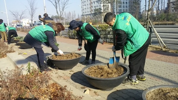 경기 김포시 장기본동 남녀새마을지도자협의회는 최근 새마을회원 17여명이 참석한 가운데 청송로 항아리형 화단을 중심으로 가로변 꽃양배추를 식재했다. 사진은 참여자들이 꽃양배추를 심고 있는 모습.(사진제공=김포시청)
