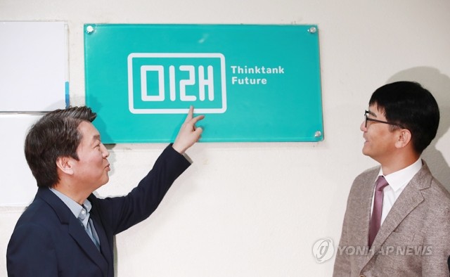26일 오후 서울 마포구 도화동 싱크탱크 미래에서 열린 현판식에서 '미래' 대표인 오승용 제2창당위원회 공동위원장(오른쪽)이 안철수 대표와 로고에 담긴 의미에 대해 대화하고 있다.