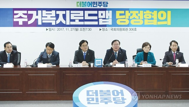 더불어민주당 김태년 정책위의장이 27일 오전 국회 의원회관에서 열린 주거복지 로드맵 당정협의에서 발언을 하고 있다. 왼쪽부터 박홍근 원내수석부대표, 조정식 국회 국토교통위원장, 우원식 원내대표, 김태년 정책위의장, 김현미 국토교통부 장관, 이원욱 제4정조위원장.