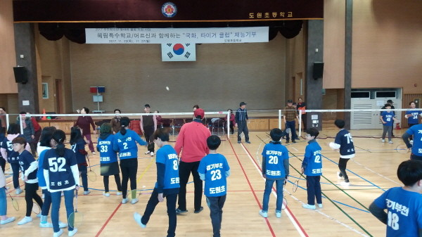 경기 부천도원초등학교는 지난 27일 교내 심성관에서 부천청소년동아리활동(국화·타이거)클럽 재능기부의 일환으로 지역사회에 있는 노인들과 함께하는 배드민턴 운동하기를 진행했다. 사진은 참여자들이 배드민턴을 치는 모습.(사진제공=부천교육지원청)