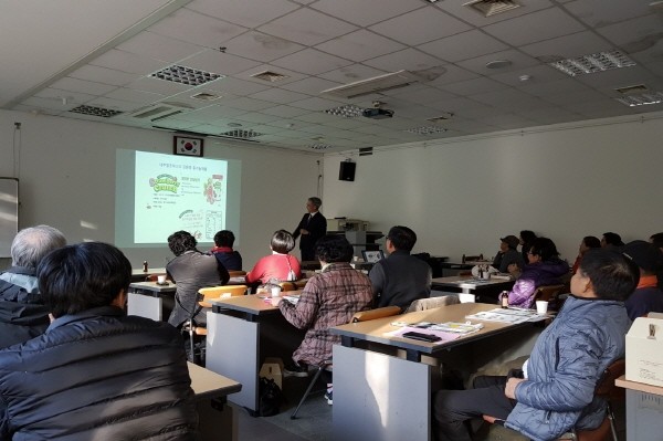 경기 김포시농업기술센터는 최근 강소농교육생 30명을 대상으로 '2017 강소농 추수교육 및 강소농사업 자체평가회'를 개최했다. 사진은 최근 농식품 가공 트렌드 및 기능성식품 가공교육에 대한 전문가 강의가 진행 중인 모습.(사진제공=김포시청)