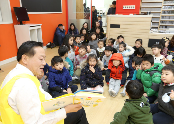 금천구는 지난 28일 오전 10시 금천구립독산도서관 어린이자료실에서 ‘책 읽어 주세요’ 명사릴레이 행사에 참여해 아이들에게 책을 읽어주는 시간을 가졌다. 사진은 행사에 참석한 차성수 구청장이 어린이들에게 책을 읽어주는 모습.