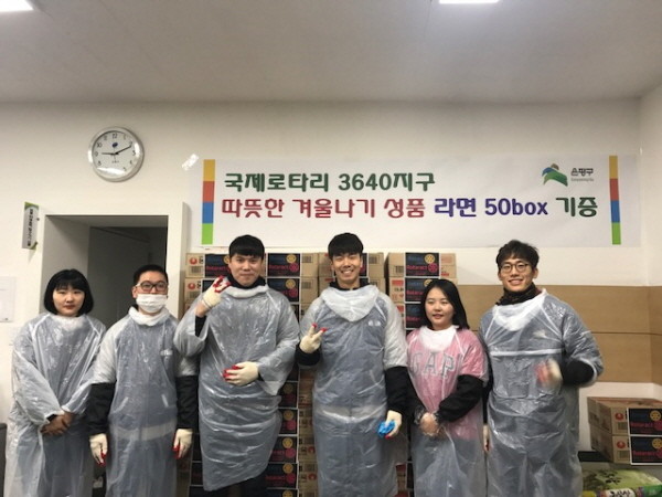 서울 은평구 수색동 주민센터가 최근 한국미쓰비시엘리베이터와 국제로타리 3640지구에서 후원받은 연탄 3000장, 50상자를 지역내 동절기 난방 취약계층 15가구에 전달했다. 사진은 라면을 기증받고 기념촬영을 하고 있는 봉사자들의 모습.(사진제공=은평구청)