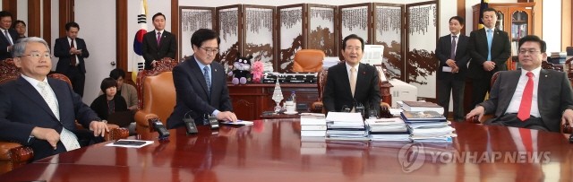 정세균 국회의장과 여야 교섭단체 원내대표 및 정책위의장들이 29일 오전 국회의장실에서 내년도 예산안 처리 문제를 협의하고 있다. 왼쪽부터 국민의당 김동철·더불어민주당 우원식 원내대표, 정세균 의장, 자유한국당 정우택 원내대표.