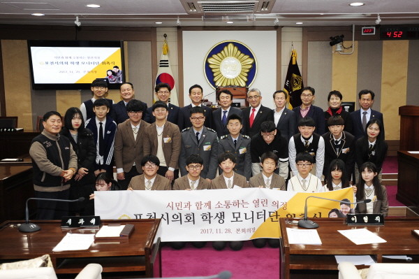 지난 28일 경기 포천시의회 학생 모니터단 위촉식이 시의회 본회의장에서 열린 가운데 정종근 의장을 비롯한 의원들과 학생들이 기념촬영을 하고 있다. (사진제공=포천시의회)