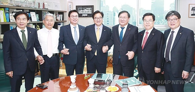 30일 오전 국회 의원회관 더불어민주당 우원식 원내대표 방에서 열린 예산안 쟁점 협의를 위한 여야 3당 2+2+2 회동에서 참석자들이 손을 잡은 채 취재진을 향해 포즈를 취하고 있다. 왼쪽부터 국민의당 이용호 정책위의장, 김동철 원내대표, 자유한국당 정우택 원내대표, 더불어민주당 우원식 원내대표, 김태년 정책위의장, 자유한국당 김광림 정책위의장, 김용진 기획재정부 2차관.