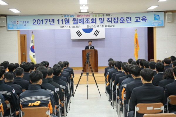 경기 안성소방서는 지난 28일 소방서 대회의실에서 소방공무원으로서 올바른 공직 윤리관과 사명감을 고취하고, 직무수행에 필요한 전문지식을 습득하도록 돕는다는 취지에서 월례조례 및 직장교육 훈련을 실시했다. 사진은 직장교육 훈련이 진행 중인 모습.(사진제공=안성소방서)