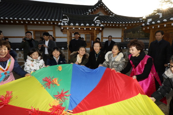 신연희 서울 강남구청장(가운데)이 지난 29일 오후 강남구 세곡동에서 열린 ‘못골 한옥 어린이도서관 개관식’에 참석해 자곡초등학교 학생들과 함께 전통놀이를 체험하고 있다.(사진제공=강남구청)