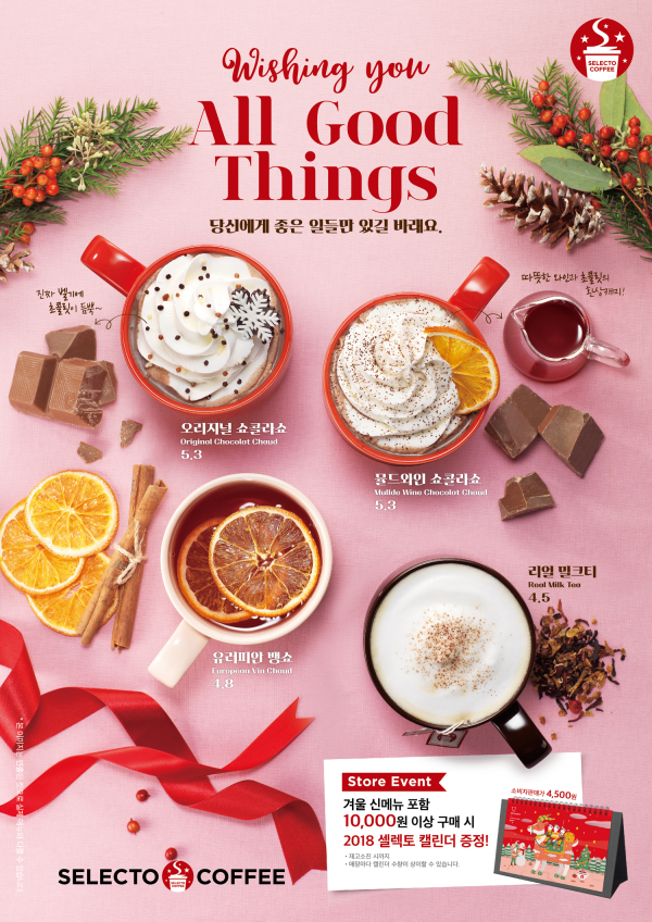 셀렉토커피의 관계자는 “크리스마스 시즌을 지나 다사다난했던 한 해를 보내고 새해를 맞는 설렘을 갖게 되는 겨울철을 맞아 셀렉토커피를 찾아 주시는 고객들께 좋은 일들만 함께 하시라는 의미를 담아 이번 신메뉴를 선보이게 됐다” 며 “따뜻한 초콜릿과 따뜻한 와인이 담고 있는 맛과 향, 그리고 건강함을 함께 즐겨보시길 바란다”고 말했다.