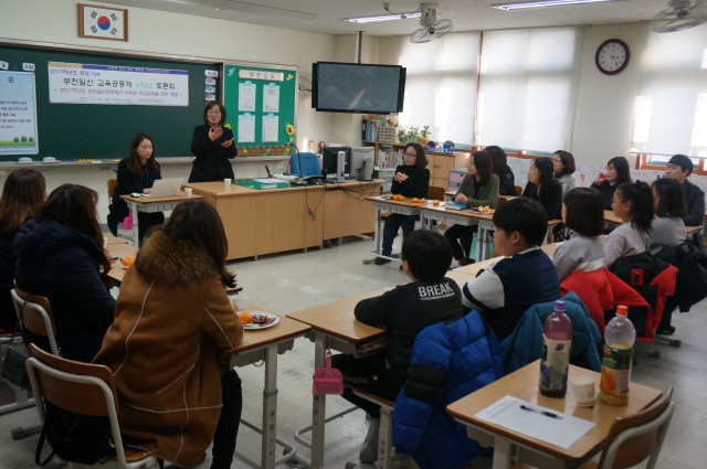 경기 부천일신초등학교는 최근 더불어 배우고 나눔을 실천하기 위한 교육공동체 대토론회를 실시했다. 사진은 이날 참여한 학생, 학부모, 교사가 함께 2017학년도 교육을 되돌아보고 2018학년도 교육을 준비하기 위해 의견을 나누는 모습. (사진제공=부천일신초등학교)