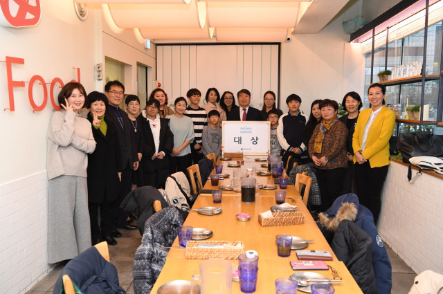 최근 백경현 경기 구리시장은 행정안전부 주관 ‘2017년 국민디자인단 성과 공유 대회’에서 공모사업인 ‘위대한 아이 꿈을 두드림’의 대통령상 수상을 위해 힘썼던 관계 공무원 및 관계자들과 간담회를 진행했다. 사진은 백 시장 및 관계자들이 기념촬영을 하는 모습. (사진제공=구리시청)