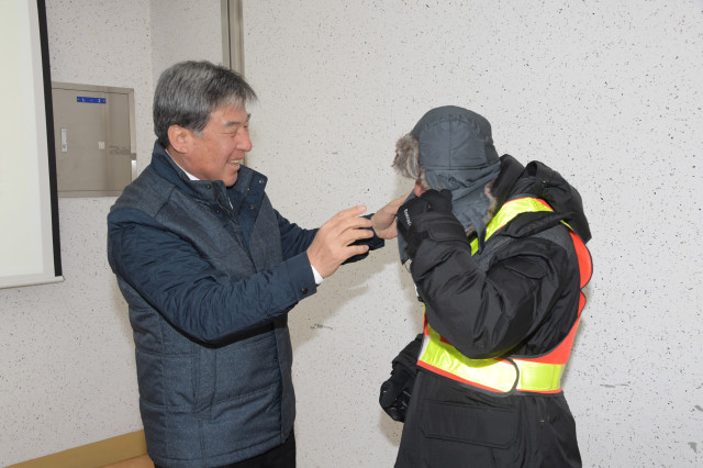 경기 동두천시는 최근 동별 폐지 줍는 노인 54명에게 방한용품을 전달하고 교통안전교육을 실시했다. 사진은 오세창 시장(왼쪽)이 노인의 방한용품 착용을 돕는 모습. (사진제공=동두천시청)