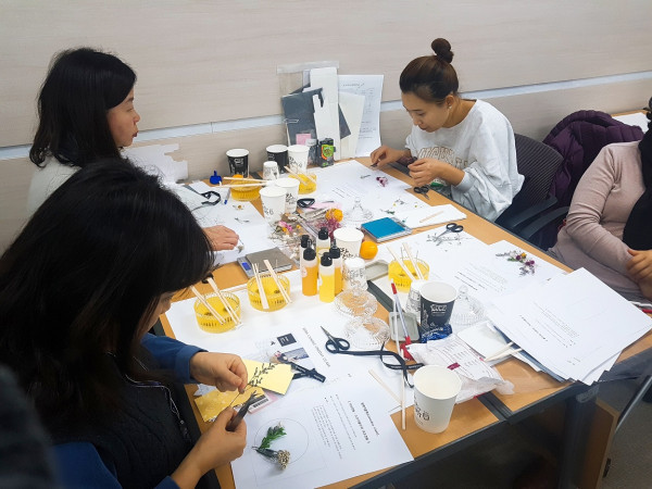 최근 경기 김포시 새일센터가 구직자와 취업자를 위한 사후관리 일환으로 40여명이 참여한 가운데 김포새일센터에서 아로마힐링 프로그램을 운영했다. 사진은 참여자들이 향초를 만들고 있는 모습. (사진제공=김포시청)
