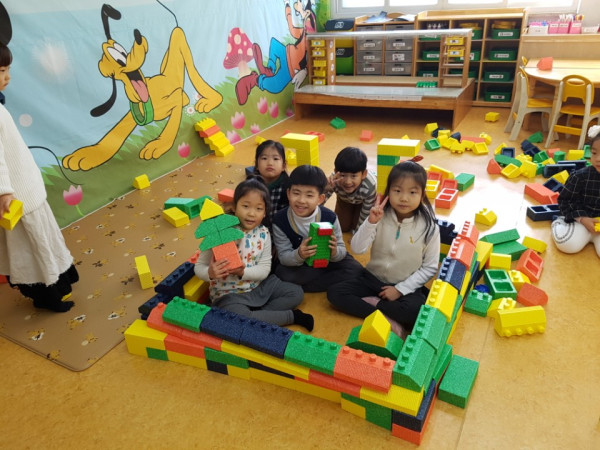 경기 부천시 상지초등학교병설유치원에서는 지난 1일 원내 체험학습 활동으로 ‘오감각 퍼포먼스 체험 놀이’를 진행했다. 사진은 어린이들이 블록놀이를 하며 즐거워하는 모습.(사진제공=상지초등학교)