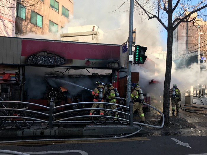 지난 4일 오후 3시22분경 서울 동작구 상도동 자전거 점포에서 화재가 발생해 동작소방서 소방대가 진압에 나섰다. 이날 화재는 20여 분만에 진화됐고 자전거 80여대 및 점포일부 소실 등의 피해를 냈다. 사진은 소방관들이 화재를 진압하는 모습.(사진제공=동작소방서)