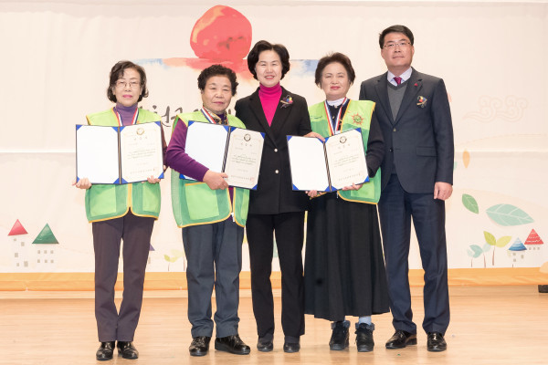 양천구가 지난 5일 구청 문화회관 대극장에서 ‘자원봉사자의 날’ 기념행사를 열었다. 사진은 김수영 구청장(가운데)과 ‘1만 시간 자원봉사왕’ 수상자 3명이 기념촬영을 하는 모습. (사진제공=양천구청)