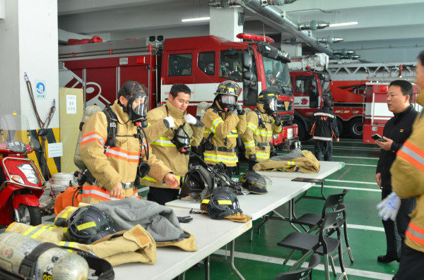 서울 영등포소방서는 6일 오전 소방서 차고에서 화재진압·구조·구급 대원 70여명을 대상으로 ‘하반기 소방전술훈련 평가’를 실시했다. 사진은 평가에 참여한 소방관들이 소방복을 착용하는 훈련에 참여하고 있는 모습. (사진제공=영등포소방서)
