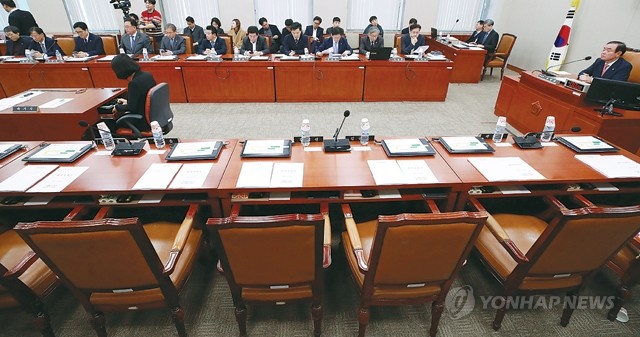 6일 오전 국회 산업통상자원중소벤처기업위원회(산자중기회)에서 열린 전체회의 때 자유한국당 의원들이 불참해 빈자리로 남아 있다. 당초 산자중기위는 이날 전기용품 및 생활용품 안전관리법 전부개정법률안(전안법) 등 주요 민생 법안들을 처리하려 했지만 자유한국당의 상임위 불참으로 법안 처리를 다음 회의로 연기했다.