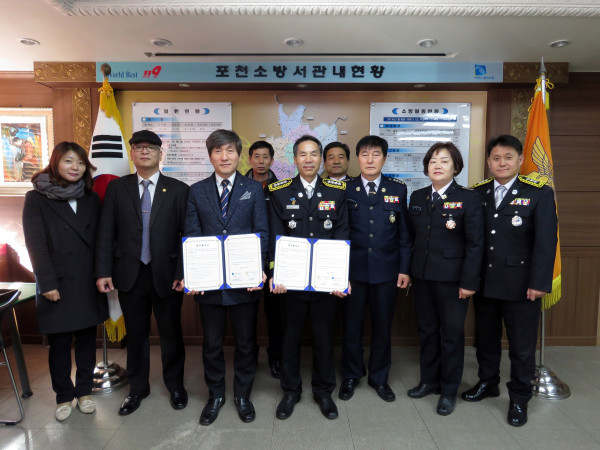 경기 포천소방서는 지난 5일 소방서장 집무실에서 (사)국제재난구조복지회와 재난사고 대응과 인명피해 최소화를 위한 ‘상호 응원협정’을 체결했다. 사진은 정상권 서장과 고영신 복지회 본부장을 비롯한 관계자들이 협약식 후 기념촬영을 하는 모습.