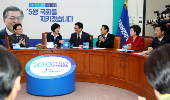 더불어민주당 추미애 대표가 6일 국회에서 열린 최고위원회의에서 내년도 예산안 처리에 수고했다며 우원식 원내대표의 손을 잡아주고 있다.