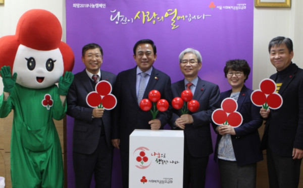 양준욱 서울시의장은 지난 6일 서울시의회 의장실에서 서울 사회복지공동모금회(서울 사랑의열매)에 이웃사랑 성금을 전달하고 나눔명사 열매달기 행사도 가졌다. 사진은 양 의장과 박찬봉 사랑의열매 중앙회 사무총장, 최은숙 서울 사랑의열매 사무처장등이 기념촬영을 하는 모습. (사진제공=서울 사회복지공동모금회)