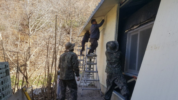 경기 연천군 청산사랑나눔회는 지난 11월16일~12월6일 4회에 걸쳐 청산면사무소 직원과 인근 부대의 군 장병 등이 참석한 가운데 저소득 장애인 가구를 위한 집수리 봉사활동을 실시했다. 사진은 집수리 활동에 참여한 장병들이 집수리를 하고 있는 모습. (사진제공=연천군청)