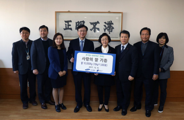 신연희 강남구청장이 최근 강남구청에서 삼성서울병원으로부터 사랑의 쌀 1000kg을 전달받았다. 이번에 전달받은 사랑의 쌀은 저소득 홀몸노인 및 기초수급자 500가구, 경로당 등에 전달될 예정이다. 사진은 신 구청장이 관계자들과 함께 기념촬영을 하는 모습. (사진제공=강남구청)