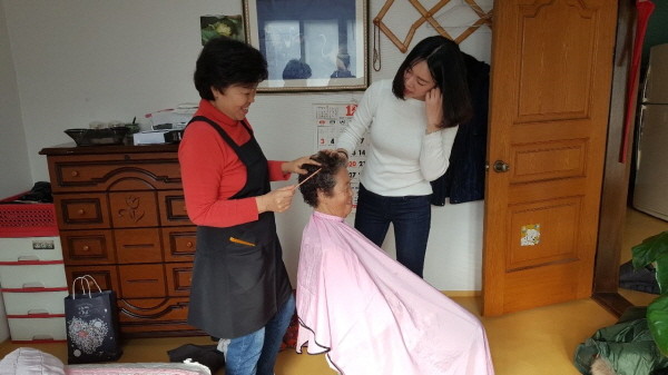 7일 경기 수원시 영통구 원천동에서는 지역사회보장협의체와 함께 거동이 불편한 저소득 노인들을 대상으로 ‘찾아가는 이·미용 봉사’를 실시했다. 사진은 협의체 위원이 노인의 머리를 손질하는 모습.(사진제공=영통구청)