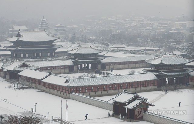 10일 경기와 강원 일부지역에 대설특보가 내려진 가운데 서울지역에도 오전 10시 총적설량이 4.3㎝를 기록해 광화문 경복궁이 하얗게 변해있다.
