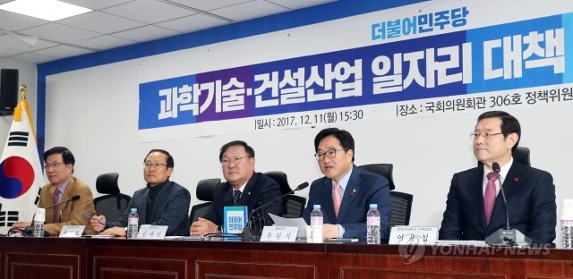 더불어민주당 우원식 원내대표(오른쪽 두번째)와 이용섭 대통령 직속 일자리위원회 부위원장(오른쪽)이 11일 오후 국회에서 열린 과학기술·건설산업 일자리 대책 당정청 협의에 참석하고 있다.