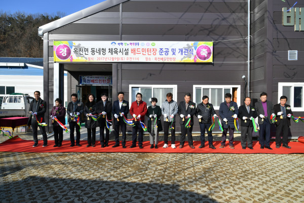 경기 양평군은 지난 9일 옥천면 일원에 예산 11억원을 투입해 조성한 ‘옥천 배드민턴장’의 개관식을 개최했다. 사진은 행사에 참석한 김선교 군수를 비롯해 군 체육회 관계자 등이 테이프 커팅에 이어 기념촬영을 하는 모습. (사진제공=양평군청)