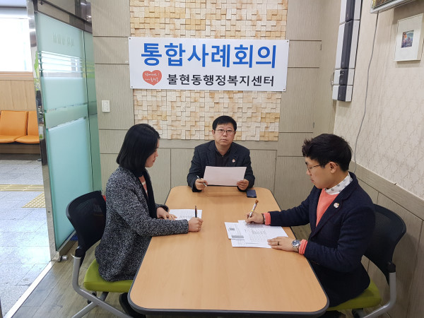 경기 동두천시 불현동행정복지센터는 12일 복지 상담실에서 동절기 복지사각지대 위기가정을 지원하기 위한 내부사례회의를 개최했다. 이날 참여자들은 복지사각지대 위기가정으로 발굴된 2가구에 대해 체납월세 지원을 결정했다. 사진은 회의가 진행 중인 모습. (사진제공=동두천시청)