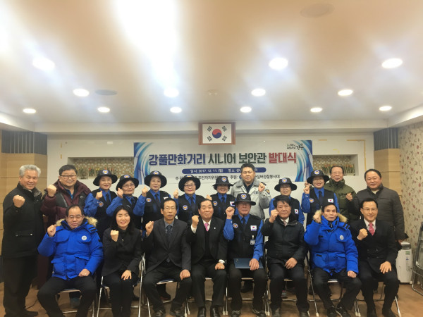서울 강동구 성내2동은 최근 성내2동 주민센터에서 ‘강풀만화거리 시니어 보안관’ 발대식을 개최했다. 시니어보안관은 강풀만화거리 순찰과 관광객 안내, 청결유지 등의 업무를 수행한다. 사진은 행사 참여자들이 기념촬영을 하는 모습. (사진제공=강동구청)