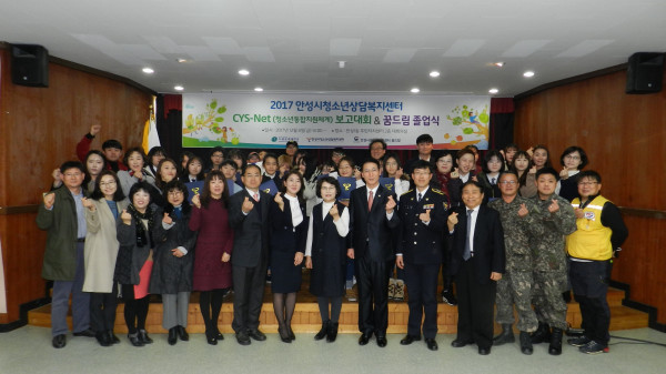 최근 경기 안성시청소년상담복지센터는 안성1동 주민자치센터 대회의실에서 ‘2017 안성시청소년상담복지센터 CYS-Net 보고대회&꿈드림 졸업식-세상밖으로 한걸음 더’ 행사를 개최했다. 사진은 행사에 참석한 관계자들이 기념촬영을 하는 모습. (사진제공=안성시청)