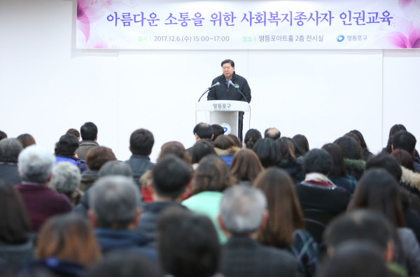 구는 지난 6일 영등포아트홀 전시실에서 복지현장에서 발생하는 인권침해 사례를 예방하자는 취지에서 ‘아름다운 소통을 위한 사회복지시설종사자 인권교육’을 실시했다.