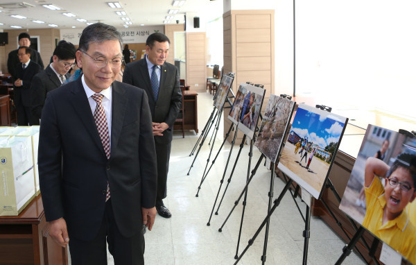 전남도교육청은 12일 도교육청 중회의실에서 올해 ‘전남교육 사진 공모전’ 당선자 37명이 참석한 가운데 시상식을 가졌다. 사진은 장만채 교육감이 출품된 작품을 살펴보는 모습. (사진제공=전남도교육청)