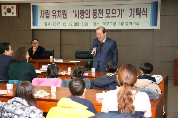 박홍섭 마포구청장이 지난 12일 마포구청 중회의실에서 열린 '사립유치원 자율장학회 장학금' 기탁식에 참석해 인사말을 하고 있다. 이날 기탁식에서는 삼성그린유치원 등 11개 유치원의 원아 및 원장들이 지난 1년간 모은 성금 525만2360원을 마포인재육성장학재단에 전달했다. (사진제공=마포구청)