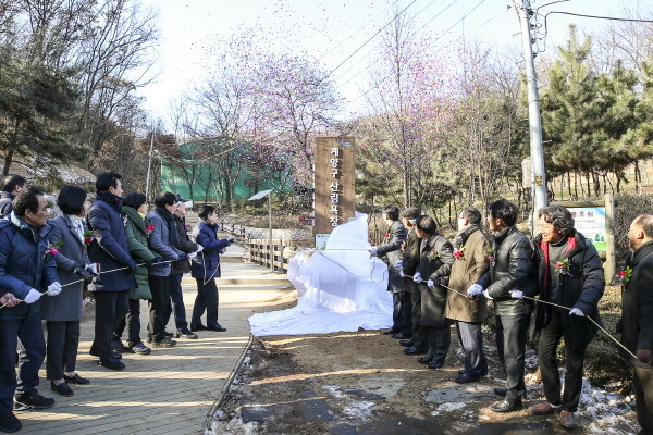 인천 계양구는 지난 13일 임학동 산림욕장 내에서 '계양구 산림욕장 준공식'을 개최했다. 사진은 준공식에서 참여자들이 현판을 제막하고 있는 모습.(사진제공=계양구청)