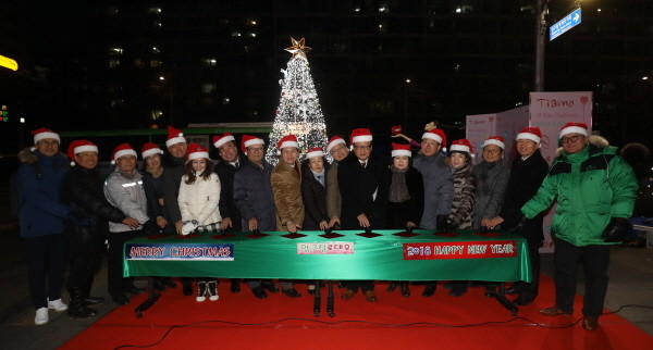 지난 13일 서울 강남구가 침체된 압구정 로데오 지역 상권을 부활시키자는 의미를 담아 압구정 로데오 입구에 대형 트리와 화단을 설치하는 등 빛의 거리를 조성했다. 사진은 크리스마스 트리 점등식에 참석한 내빈들이 대형 크리스마스 트리에 점등을 하고 있는 모습.(사진제공=강남구청)