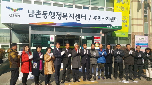 최근 경기 오산시 남촌동 행정복지센터가 행정복지센터 체제 출범에 따라 동주민센터 간판을 교체하는 현판식을 개최했다. 사진은 현판식에 참석한 내빈들이 박수를 치고 있는 모습.(사진제공=오산시청)