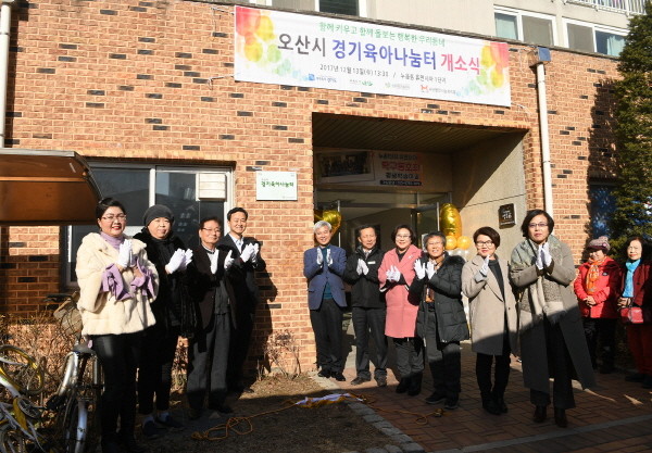 경기 오산시는 누읍동 휴먼시아1단지아파트 111동 커뮤니티실에 125㎡ 규모의 ‘오산시 경기육아나눔터 2호점’을 조성하고, 지난 13일 개소식을 개최했다. 사진은 행사에 참여한 관계자들이 기념촬영을 하는 모습.(사진제공=오산시청)
