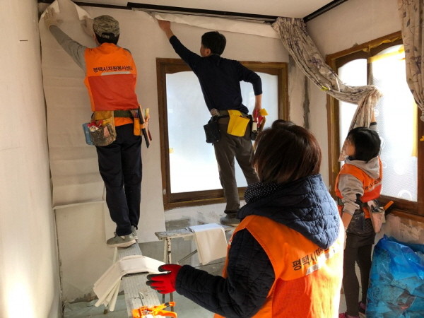 경기 평택시자원봉사센터는 지난 15일 지진피해를 입은 경북 포항시 북구 소재 2가구를 방문해 집수리 봉사활동을 진행했다. 사진은 행사에 참석한 자원봉사센터 관계자들이 집수리 활동의 일환으로 도배를 하고 있는 모습.(사진제공=평택시청)