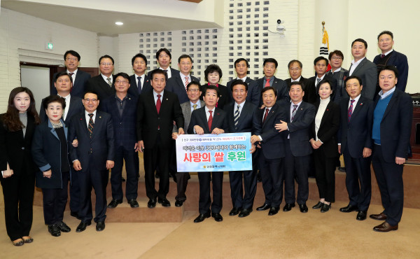 인천시의회는 지난 15일 연말을 맞이해 ‘따뜻한 이웃이 함께하는 행복한 도시를 만든다’는 슬로건 아래 이웃사랑을 실천하고자 2017 사랑의 쌀 323포(10kg)을 행복나눔인천에 기탁했다. 사진은 기탁식에 참석한 의원들이 기념촬영을 하는 모습.(사진제공=인천시의회)