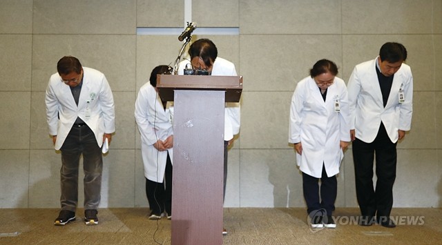 17일 오후 서울 이대목동병원에서 정혜원 병원장(오른쪽 두 번째) 등 관계자들이 전날 오후 9시부터 11시까지 2시간 동안 이 병원 인큐베이터에 있던 신생아 4명이 잇따라 숨진 사건이 발생한 것과 관련해 브리핑하며 사과의 절을 하고 있다.