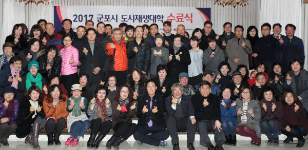 경기 군포시는 지난 15일 여성회관 대회의실에서 ‘2017 도시재생대학 수료식’을 개최해 교육과정을 마친 66명에게 수료증을 수여했다. 시는 지난 10월부터 김포대학교 산학협력단에 위탁해 도시재생대학을 운영해왔다. 사진은 수강생들이 기념촬영을 하는 모습. (사진제공=군포시청)